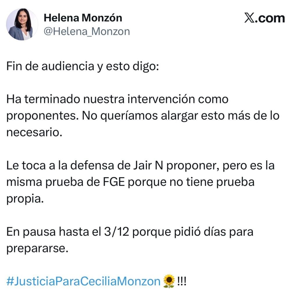 Helena Monzón afirmó que el juicio entró en su etapa final y que la resolución podría conocerse próximamente. No obstante, indicó que otro proceso —el de violencia familiar iniciado por Cecilia en vida contra Javier N.— permanece suspendido provisionalmente debido a un amparo promovido por el imputado, pese a que ya fue declarado culpable.