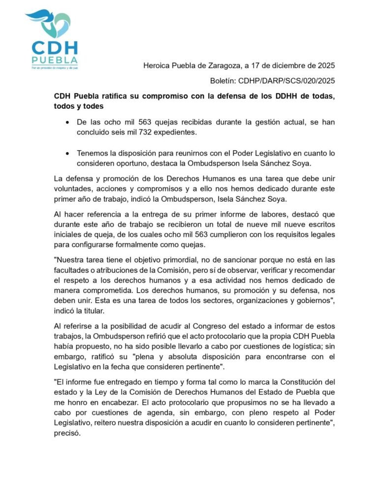 La presidenta de la Comisión de Derechos Humanos (CDH) de Puebla, Rosa Isela Sánchez Soya, no comparecerá ante la Comisión de Derechos Humanos del Congreso del Estado como se había anunciado, y su presentación ante diputados fue aplazada hasta enero de 2026.