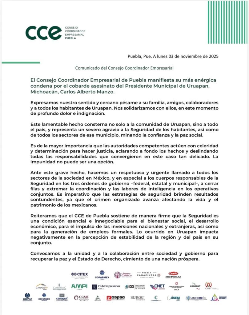 El Consejo Coordinador Empresarial (CCE) de Puebla expresó su más enérgica condena por el asesinato del presidente municipal de Uruapan, Michoacán, Carlos Alberto Manzo, ocurrido la noche del domingo.