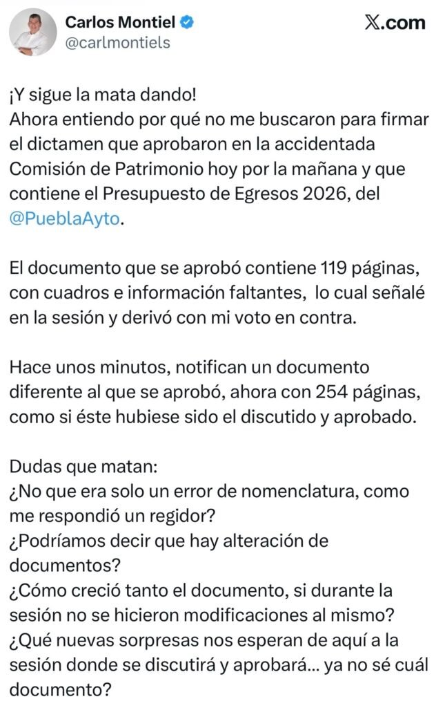 Regidores de oposición del Ayuntamiento de Puebla denunciaron inconsistencias y falta de transparencia en el anteproyecto del Presupuesto de Egresos 2026, que contempla un monto superior a los 7 mil 400 millones de pesos, al advertir que el documento entregado para su análisis no coincide con el que se pretende someter a votación en Cabildo.