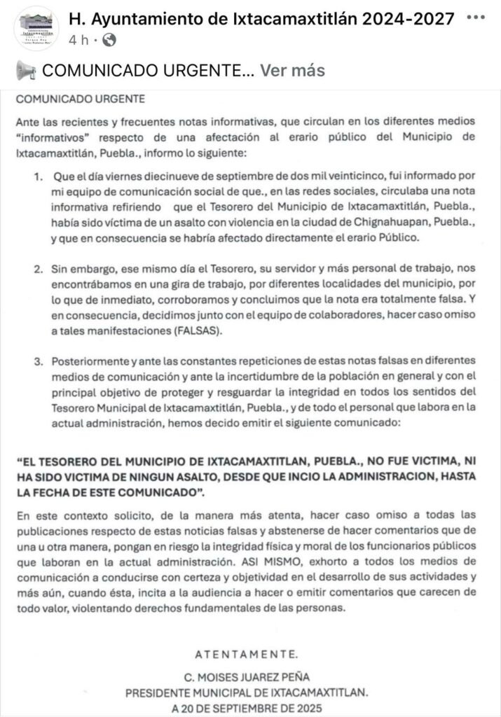 “El Tesorero del Municipio de Ixtacamaxtitlán, Puebla, no fue víctima, ni ha sido víctima de ningún asalto desde el inicio de la administración hasta la fecha de este comunicado”, enfatizó Juárez Peña.