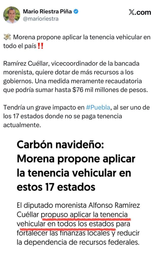 “Ramírez Cuéllar, vicecoordinador de la bancada morenista, quiere dotar de más recursos a los gobiernos. Una medida meramente recaudatoria que podría sumar hasta $76 mil millones de pesos. Tendría un grave impacto en #Puebla, al ser uno de los 17 estados donde no se paga tenencia actualmente”, publicó Riestra Piña en sus redes sociales.
