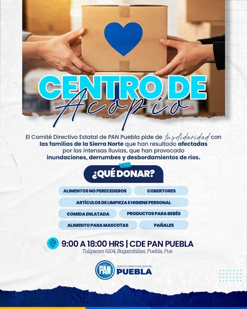 El centro de acopio opera en las instalaciones del CDE PAN Puebla, ubicadas en Tulipanes 6104, colonia Bugambilias, en la capital poblana.
